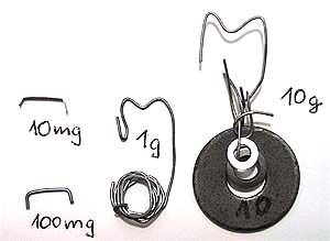 Die Laufgewichte werden am Besten wie auf der Skizze gebogen, wobei natürlich zu berücksichtigen ist, dass die Halterung Bestandteil des Gewichts ist. Das 100 mg und das 10 mg Gewicht ist nur noch ein Haken wie eine Heftklammer. Man kann das mit dem Teilen noch einmal eine Teilung weiter treiben. Dazu habe ich am linken Ende des Balkens eine Markierung bei 197,5 gesetzt und rechts das 10 mg Gewicht aufgelegt. Dann aus üblicher Haushalts-Alufolie einen 5 mm breiten Streifen geschnitten, ca 8 cm lang. Dieser wird jetzt links auf die Markierung gelegt und so lange eingekürzt, bis die Waage im Gleichgewicht ist. Jetzt nimmt man den Streifen ab, misst die Länge und teilt diese durch 9. Dann markiert man die Stellen 5, 7 und 9 auf dem Streifen und schneidet durch. Dann haben wir ein 5 mg, zwei 2 mg und ein 1 mg Gewicht(e) (zumindest annähernd ;-) !). Nimmt man dann alles von der Waage runter und tariert aus, dann sehe ich bei mir, dass beim Auflegen von 2 mg bzw. 3 mg der Balken sich langsam nach unten bewegt. Das ist dann die Empfindlichkeit der Waage: Dieser Wert ist nicht schlecht. Das 1 mg Gewicht ist ein Quadrat von ca. 5 mm Kantenlänge aus der erwähnten normalen Haushalts-Alufolie. ( Zurück zum Inhaltsverzeichnis ) |